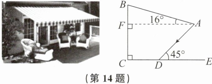 14. (10分)为建设美好公园社区,增强民众生活幸福感,某社区服务中心在文化活动室墙外安装避阳篷,便于社区居民休憩.如图,在侧面示意图中,$AF⊥BC$,遮阳篷AB长为5m,与水平面的夹角为$16^{\circ }$,且靠墙端离地高BC为4m,当太阳光线AD与地面CE的夹角为$45^{\circ }$时,求: