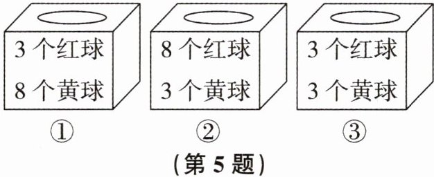 5. 抽奖啦! 现有3个不透明箱子,箱子内放有若干小球(除颜色外其余均相同).规定:每次只能摸一个小球,摸出红球奖励一杯奶茶,摸出黄球奖励一支雪糕.若小丽想得到一杯奶茶,应选择从