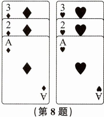 8. 如图所示为从一副扑克牌中取出的两组牌,分别是红桃A,2,3和方块A,2,3(A表示数字1),将它们的背面朝上分别重新洗牌后,再从两组牌中各摸出一张.摸出的两张牌的牌面数字之和“大于等于5”和“小于5”哪个可能性大?