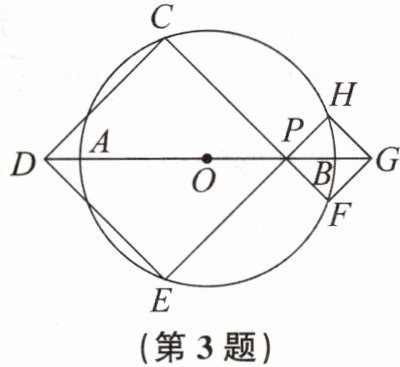 3. 如图,点P在$\odot O$的直径AB上,作正方形PCDE和正方形PFGH,其中点D,G在直径所在的直线上,点C,E,F,H都在$\odot O$上.若两个正方形的面积之和为16,$OP= \sqrt {2}$,求DG的长.