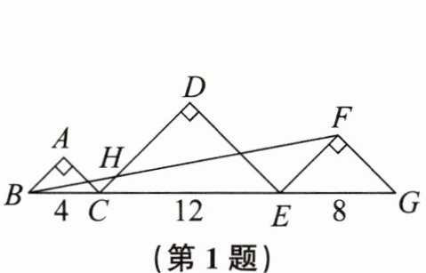 1. (2024秋·湖州长兴期末改编)如图,三个等腰直角三角形拼接在一起,$∠A= ∠D= ∠EFG= 90^{\circ }$,且它们的斜边BC,CE,EG在同一直线上,连结BF交CD于点H,若$BC= 4,CE= 12,EG= 8$,则DH的长为 (