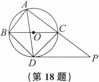 18. (14分)如图,$\odot O是△ABC$的外接圆,点O在BC上,$∠BAC的平分线交\odot O$于点D,连结BD,CD,过点D作BC的平行线与AC的延长线相交于点P.
