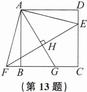 13. 如图,点 E 在正方形 ABCD 的边 CD 上,将△ADE 绕点 A 按顺时针方向旋转 90°到△ABF 的位置,连结 EF,过点 A 作 FE 的垂线,垂足为 H,与 BC 相交于点 G.