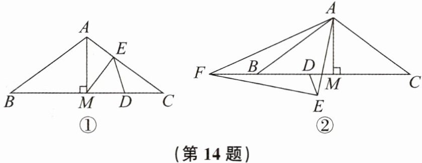14. 在△ABC 中,∠B = ∠C = α(0° < α < 45°),AM⊥BC 于点 M,D 是线段 BC 上的动点(不与点 B,C,M 重合),将线段 DM 绕点 D 按顺时针方向旋转 2α 得到线段 DE.
