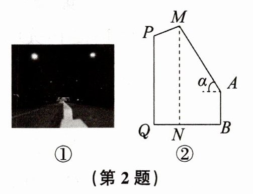 2. (2023·湖州南浔模拟)图①为某路灯的实物图,图②是其示意图,一数学项目目学习小组要测量某路灯$Q-P-M$的顶部到地面的距离MN的长,他们借助卷尺、测角仪进行测量,测量结果如下: