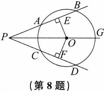 8. 如图,PO是$\odot O$的直径所在的直线,且PO平分$∠BPD,OE⊥AB,OF⊥CD$. 有下列结论:①$AB= CD$;②$\widehat {AB}= \widehat {CD}$;③$PO= PE$;④$\widehat {BG}= \widehat {DG}$.其中正确的是______