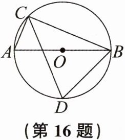 16. 如图,以$AB为直径作\triangle ABC$的外接圆,点$O$为圆心,点$C恰好在\odot O$上,$∠ACB的平分线交\odot O于点D$,连结$BD$。