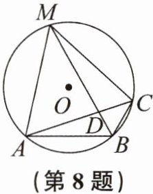 8. 如图,在⊙O中,B是⊙O上的一点,∠ABC= 120°,弦AC= 2√{3},弦BM平分∠ABC交AC于点D,连结MA,MC.求⊙O的半径为
