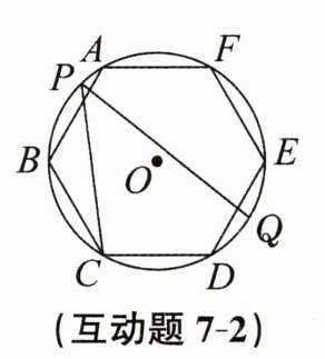 互动题7-2 如图,正六边形$ABCDEF内接于\odot O$,点$P在\overset{\frown}{AB}$上,$Q是\overset{\frown}{DE}$的中点,则$\angle CPQ$的度数为