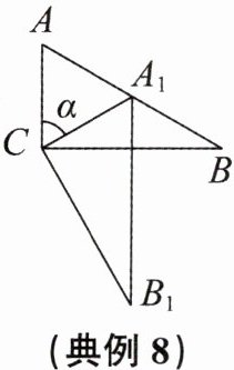 典例8 (2024秋·绍兴诸暨期末)如图,将直角三角尺$ABC绕直角顶点C按顺时针方向旋转角度\alpha得到Rt\triangle A_1B_1C$,点$A_1在斜边AB$上.若$\angle A= 60^{\circ}$,$AC= 5$,则点$A运动路径的长度及边AC$扫过的面积分别是(