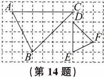 14. $\triangle ABC与\triangle DEF$在网格中的位置如图所示,每个小正方形的边长都是1。在AB,AC,BC,EF,DE,DF这六条线段中,找出所有的比例线段。