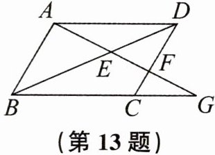 13. 如图,在$□ A B C D$中,$G是BC$延长线上的一点,$AG分别与BD$,$DC相交于点E$,$F$. 若$C G = \frac { 1 } { 2 } B C$,求$\triangle A B E与\triangle F D E$的周长之比.