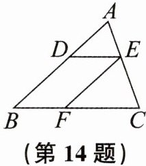 14. 如图,在$\triangle A B C$中,$D E // B C$,$E F // A B$. 已知$\triangle A D E和\triangle E F C的面积分别为4 \mathrm { cm } ^ { 2 }和9 \mathrm { cm } ^ { 2 }$,求$\triangle A B C$的面积.