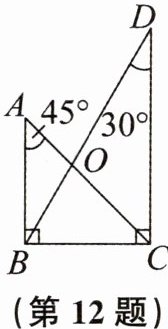 12. 若一副三角尺按如图所示的方式叠放,则$\triangle A O B与\triangle D O C$的面积之比为______
