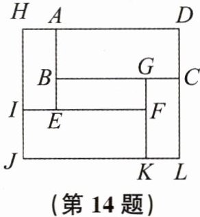 14. 一个大矩形按如图所示方式分割成五个小矩形后仍是中心对称图形,已知$BC = a$,$CD = b$,$AE = c$,$IE = d$,且矩形$ABCD\backsim矩形BEFG$。设矩形$ABCD与矩形AHIE的面积分别为m和n$,请用含$m$,$n的代数式表示这个大矩形DHJL$的面积。