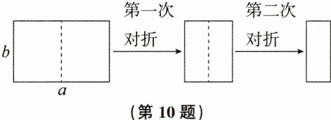 10. 如图,把一张长为$a$、宽为$b$的矩形纸片对折两次后得到一张小矩形纸片,若小矩形与原矩形相似,则原矩形纸片的边$a$,$b$应满足的条件是(