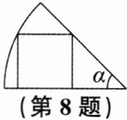 8. 将一张圆心角为α的扇形纸板按如图所示的方式剪得一个正方形,正方形的边长为5cm,已知$tanα= 1$,求扇形纸板的弧长.