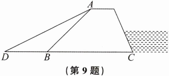 9. 某防洪大堤的横断面如图所示,背水坡的坡面AB的长度为20m,坡比为$1:1$(坡比为坡面的垂直高度与水平宽度的比),汛期来临前要对背水坡进行加固,改造后的背水坡的坡面AD的坡比为$1:2$,求改造后的背水坡AD的长度.