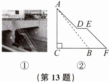 13. 某市为排除隧道安全隐患,根据各段隧道空间情况,在不影响交通的情况下,加装了大小、形状不一的19条人行逃生爬梯.如图①,起初工程师计划修建一段坡角为$50^{\circ }$(即$∠ABC= 50^{\circ },∠BAC= 40^{\circ }$)的爬梯AB,从安全角度再次考虑,工程师对爬梯的设计进行了修改,如图②,修建了AD,EF两段平行的爬梯,并在中间修建了1米的水平平台DE,C,B,F三点共线,小明实地测量后得到AC为4米,CF为5米.