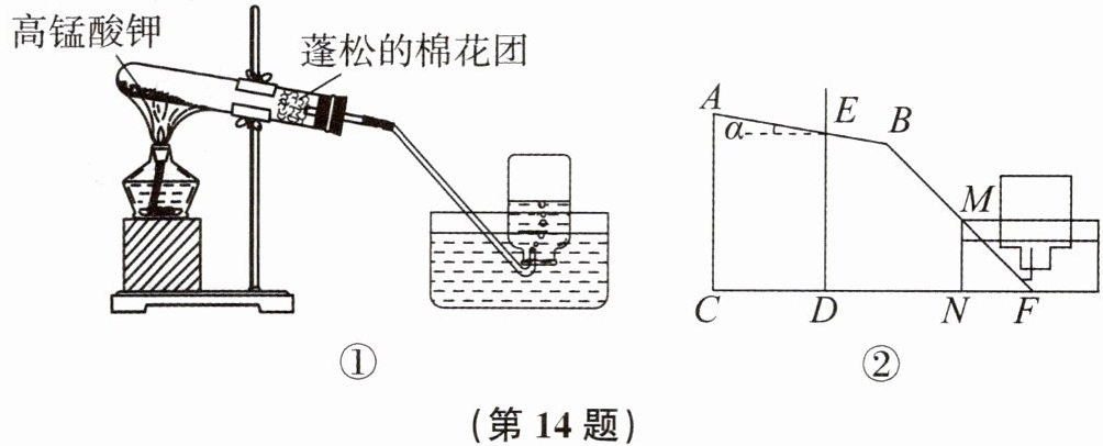 14. 实验是培养学生的创新能力的重要途径之一.如图①所示为小红同学安装的某实验装置,安装要求为试管略向下倾斜,试管夹应固定在距试管口的三分之一处.如图②,已知试管$AB= 24cm,BE= \frac {1}{3}AB$,试管的倾斜角α为$10^{\circ }$.(结果精确到0.1cm.参考数据:$sin10^{\circ }\approx 0.17,cos10^{\circ }\approx 0.98,tan10^{\circ }\approx 0.18$)
