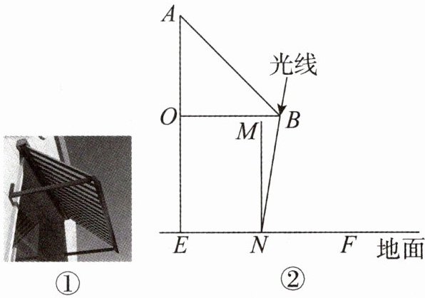 跟踪训练1 如图①所示为一款摆臂遮阳篷的实物图,如图②所示为其侧面示意图,A,O为墙壁上的固定点,AO= 1.5 m,摆臂OB可绕点O旋转,旋转过程中遮阳篷AB可自由伸缩,篷面始终保持平整,当摆臂OB与墙壁垂直时,身高为1.65 m的同学(MN= 1.65 m)站在遮阳篷下时,距离墙角1.2 m(EN= 1.2 m)处,刚好不被阳光照射到,测得此时AB与摆臂OB的夹角∠ABO= 45°,光线与水平地面EF的夹角∠BNF= 71°,则AE的高度约为______m(结果精确到0.1 m.参考数据:$\sin 71^\circ \approx 0.95$,$\cos 71^\circ \approx 0.33$,$\tan 71^\circ \approx 2.90$,$\sqrt{2}\approx 1.41$).