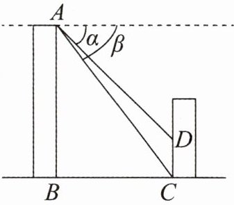 他在对面楼房处放置一个3 m的标杆CD,然后他在A处测得C点的俯角β为53°,再测得D点的俯角α为45°,则两幢楼房之间的水平距离大约为(参考数据:$\sin 53^\circ \approx \frac{4}{5}$,$\cos 53^\circ \approx \frac{3}{5}$,$\tan 53^\circ \approx \frac{4}{3}$)(