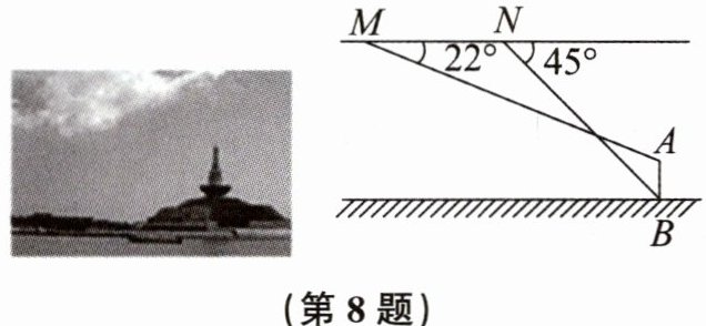 8. 某数学兴趣小组用无人机测量潮汐塔AB的高度,测量方案如图所示:无人机在距水平地面119m的点M处测得潮汐塔顶端A的俯角为$22^{\circ }$,再将无人机沿水平方向飞行74m到达点N,测得潮汐塔底端B的俯角为$45^{\circ }$(点M,N,A,B在同一平面内),则潮汐塔AB的高度约为(结果精确到1m。参考数据:$sin22^{\circ }\approx 0.37$,$cos22^{\circ }\approx 0.93$,$tan22^{\circ }\approx 0.40$)(