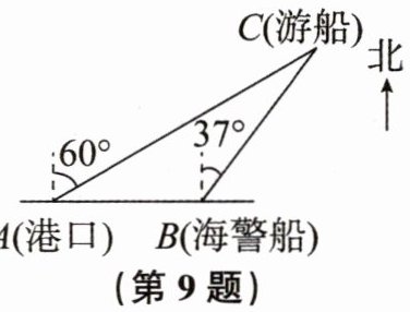 9. 一艘观光游船从港口A以北偏东$60^{\circ }$的方向出港观光,航行80海里至C处时发生了侧翻事故,立即发出了求救信号。一艘在港口正东方向的海警船接到求救信号,测得事故船在它的北偏东$37^{\circ }$方向,马上以40海里/时的速度前往救援。海警船大约需