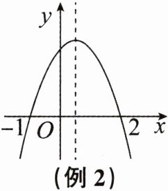例2 (2024秋·金华金东期末)如图,抛物线$y= ax^{2}+bx+c(a≠0)与x轴交于点(-1,0)和点(2,0)$,以下结论:①$abc<0$;②$4a-2b+c<0$;③$a+b= 0$;④当$x<\frac {1}{2}$时,$y随x$的增大而减小.其中正确结论的个数为(