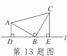 13. 如图,直线$l过等腰直角三角形ABC的顶点B$,$AD⊥l于点D$,$CE⊥l于点E$,且$AD= 2$,$CE= 3$,则$DE$的长为()