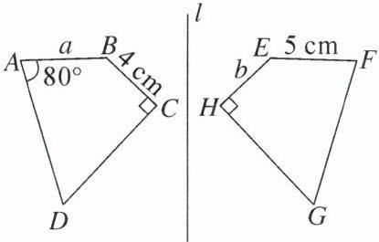 解:由对称性,得$a = EF = 5\mathrm{cm}$,$b = BC = 4\mathrm{cm}$,$\angle F = \angle A = 80^{\circ}$。