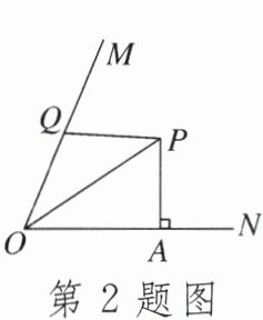 2.如图,$OP平分∠MON$,$PA⊥ON于点A$,点$Q是射线OM$上的一动点.若$PA= 2$,则$PQ$的最小值为 ()