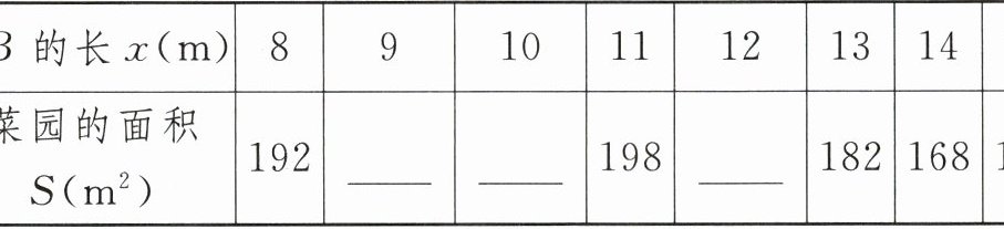 | 菜园的面积$S(m^{2})$ | 192 | ______ | ______ | 198 | ______ | 182 | 168 | 150 | … |