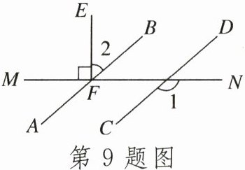 9.如图,已知直线$EF⊥MN$,垂足为F,且$∠1= 140^{\circ }$,则当$∠2$等于______时,$AB// CD$ ()