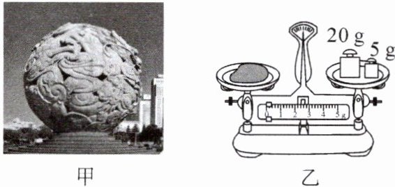 5. 如图甲所示是某城市的一座雕塑,官方报告称该雕塑重18.5t,小亮想知道该雕塑的体积,于是他找到与雕塑同材质的实心石块作为样品,测量样品的质量如图乙所示,用量筒测得样品的体积是$10cm^{3}$,则样品的密度为______$kg/m^{3}$,雕塑的体积为______$m^{3}$。