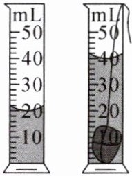 2. 小明在海边游玩时发现一颗颜色鲜艳的石头(不考虑石头的吸水性),便拿回家想要测量它的体积,如图所示,则此石头的体积为______$cm^{3}$;由于细线具有一定的体积,小明所测得石头的体积比真实值______(选填“大”或“小”)。