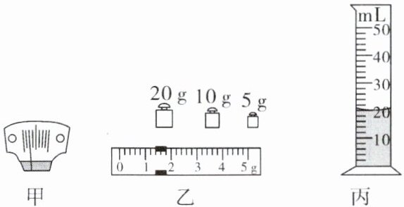 (2)将装有适量某液体的小杯子放在天平的左盘上,天平平衡时,所用砝码和游码在标尺上的位置如图乙所示,若小杯子的质量为20g,则小杯子中液体的质量为______g;然后将小杯子中的液体全部倒入量筒中,液面到达的位置如图丙所示,由此可计算出液体的密度为______$kg/m^{3}$。