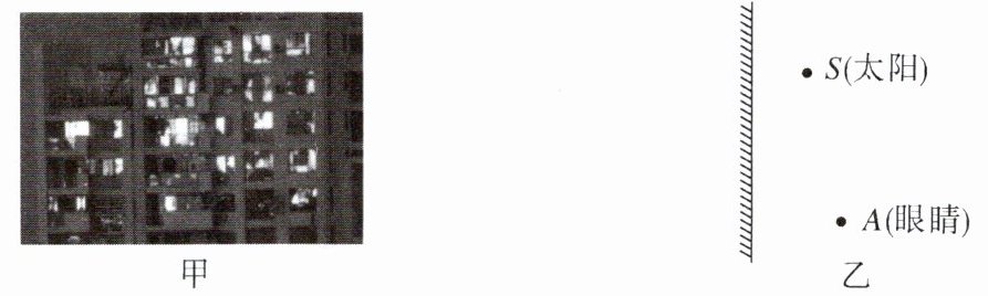 我们的生活中也有类似的现象发生。一则新闻曾记载:一位市民看到一公里外有一幢居民楼高层"着火"了,"火势猛烈",已经"烧"了好几层楼,如图甲所示。他急忙与同事讨论是否要报警,但是仔细观察发现,虽然房屋看起来像是着火了,却没有火灾中常出现的浓烟。原来这个现象主要是由平整的建筑玻璃引起光的反射造成的,加上当天夕阳的颜色比较红,造成类似火焰的视觉效果,只有处在特定角度的人才能看到,反而身处其中的人无法看到。请你在图乙中画出这位市民看到"着火"的光路图。
