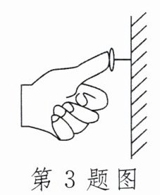 3. 装修结束后,小明需要将一些图钉压进墙壁来固定一些字画。已知一个图钉帽的面积是$0.8cm^2,$图钉尖的面积是$5×10⁻^4cm^2,$墙能承受的最大压强是$4×10^8Pa,$如图所示,手指至少要用____N的力,图钉尖才能被压进墙壁。小明在按图钉时,能把图钉按进墙壁,而手指的感觉却没那么强烈的原因是____。