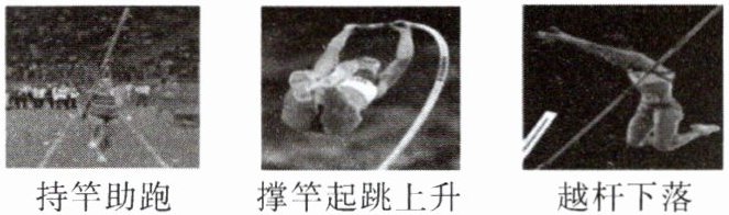 3. 如图所示是撑竿跳高运动员的几个阶段:持竿助跑、撑竿起跳上升、越杆下落。在撑竿起跳上升阶段,竿的弹性势能______(选填“一直变大”“一直变小”或“先变大后变小”)。越过横杆下落的过程,运动员的重力势能转化为______能。