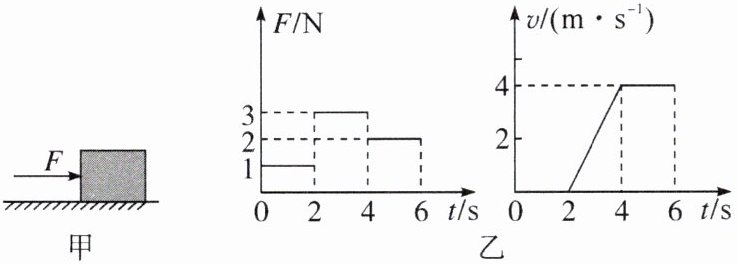 10. (多选题)一只木箱放在水平地面上,地面上各处粗糙程度相同,对木箱施加一个方向不变的水平推力$F$(如图甲),$F的大小与时间t$的关系、木箱的运动速度$v与时间t$的关系图像如图乙所示。下列说法中正确的是()
