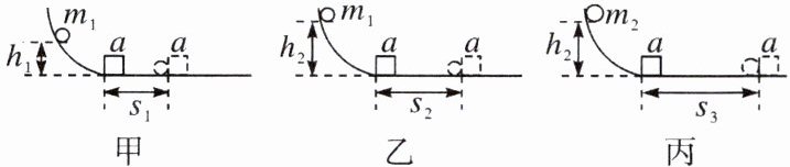9. 为了“探究物体动能的大小跟哪些因素有关”,某课外兴趣小组的同学们设计了如图所示的实验操作。其中小钢球质量分别是$m_{1}和m_{2}且m_{1}<m_{2}$,$s_{1}<s_{2}<s_{3}$,$a$为木块。实验过程中的圆弧轨道、水平面和木块均不变。下列说法正确的是()