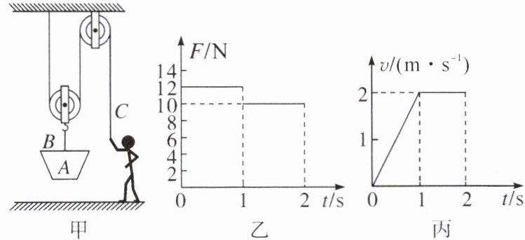 6. 如图甲所示的装置,$A是重15N$的空吊篮,绳子$B和C能承受的最大拉力分别为100N和60N$。质量为$50kg的小周同学将A$提升到高处,施加的拉力$F随时间t$变化关系如图乙所示,$A上升的速度v随时间t$变化关系如图丙所示。忽略绳重及摩擦,则动滑轮的重力为____$N$,该装置最多能匀速提升____$N$的重物。