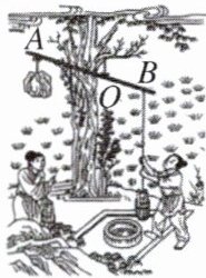 9. 如图所示,是《天工开物》中记载的我国传统提水工具“桔槔”,用绳子系住一根直的硬棒的$O$点作为支点,$A端拉有重为40N$的石块,$B端挂有重为10N$的空桶,$OA长为1.2m$,$OB长为0.6m$。使用时,人向下拉绳放下空桶,装满重为$100N$的水后向上拉绳缓慢将桶提起,硬棒质量忽略不计。下列说法中正确的是()