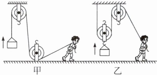 4. 如图所示,快递小哥为了把较重的货物装入运输车,用同样的器材设计了甲、乙两种方式提升货物(货物比动滑轮重)。若把同一货物匀速提升到同一高度,忽略绳重和摩擦,则两种方式所用的拉力$F_{甲}$______$F_{乙}$;所做的有用功$W_{甲}$______$W_{乙}$;滑轮组的机械效率$\eta_{甲}$______$\eta_{乙}$。(均选填“>”“<”或“=”)