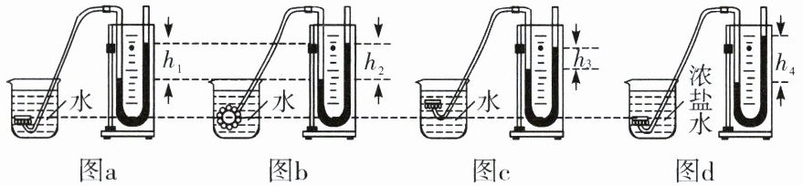 17.“帕斯卡裂桶实验”的演示,激发了学生探究“影响液体压强大小因素”的兴趣。他们设计了如图所示的实验探究方案,图a、b、d中金属盒在液体中的深度相同,a、b中金属盒方向不同。实验测得几种情况下压强计的U形管两侧液面高度差的大小关系是$h_{4}>h_{1}= h_{2}>h_{3}$。