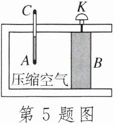 5. 如图所示,B是一个被销钉锁住的活塞,气缸A内密封有压缩空气,C是一支温度计,若活塞与气缸壁之间没有摩擦,当把销钉K拔出后,将观察到活塞向右移动,温度计的示数____(选填“升高”“降低”或“不变”),原因是____。