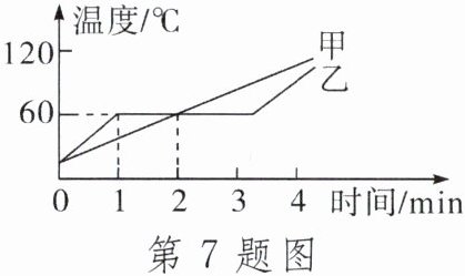 7. 用相同的装置给质量相等的甲、乙两种物体加热,它们的温度随时间变化情况的一部分如图所示。当加热至2min时,将甲和乙紧密接触在一起,它们之间____(选填“会”“不会”或“不一定会”)发生热传递;从第1min到第2min,乙的内能____(选填“增加”“减少”“不变”或“先增加后不变”)。