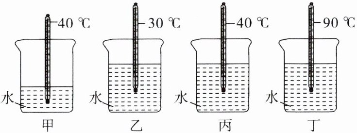 1. 如图所示,甲杯中水量较少,乙、丙、丁杯中的水量相同,根据内能的知识,甲、乙两杯水的内能____(选填“甲大”“乙大”或“无法比较”)。四杯水中,____杯中水的内能最大。