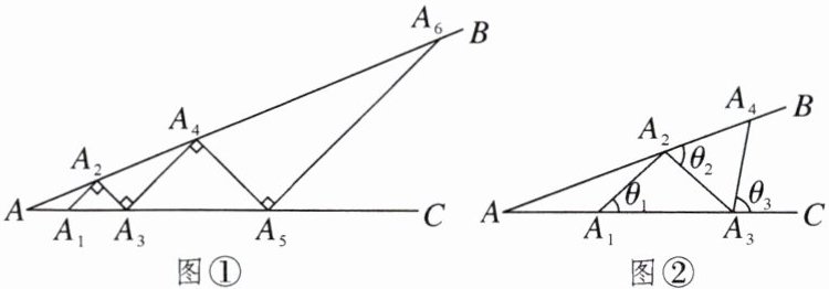 活动二:如图②所示,从点$A_1$开始,用等长的小棒依次向右摆放,其中$A_1A_2$为第1根小棒,且$A_1A_2 = AA_1$.
